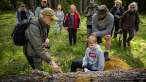 Den 17 maj firade vi i Surahammar den ”Biologiska mångfaldens dag”, som en fortsättning på skogsdagen som arrangerades i Folkets hus den 15 mars. Det var inspiratören och naturfotografen Anders Geidemark som tillsammans med Naturskyddsföreningen Surahammar bjudit in allmänheten till en vandring i vårt fina naturreservat Kohagen. Ett 20-tal deltagare guidades av undertecknad genom gammal naturskog rikligt med död ved, genom örtrik hassellund och genom det öppna landskapet med äng och naturbetesmark och med utblick över Kolbäcksåns vatten. Variation och mångfald präglade naturen och även deltagarskaran med unga och vuxna och en trevlig badsugen hund. En hel del vedlevande svampar påvisades, så som ullticka, gränsticka, aspskål och stora hattbildande arter som klibb- och fnöskticka. Kul var att vi hittade fina fruktkroppar av kantörsporing, växande på hassel tillsammans med ”symbiosarten” kantöra.